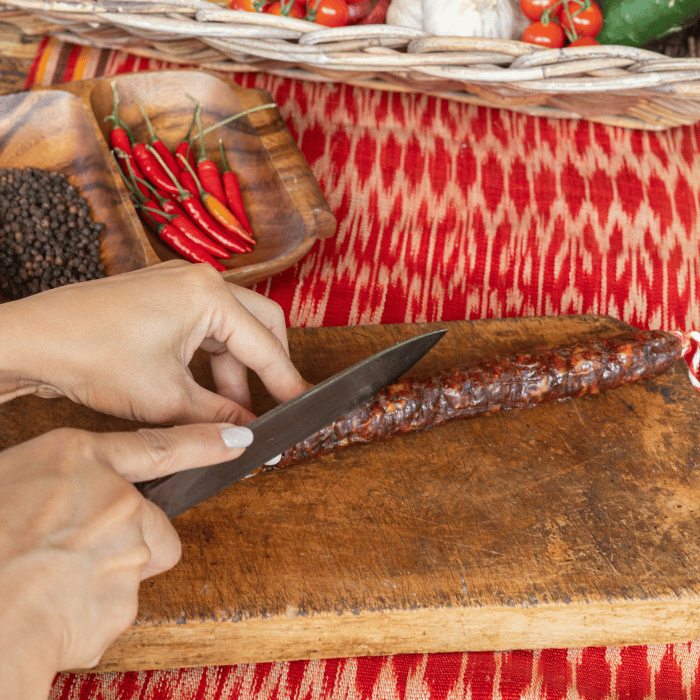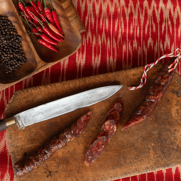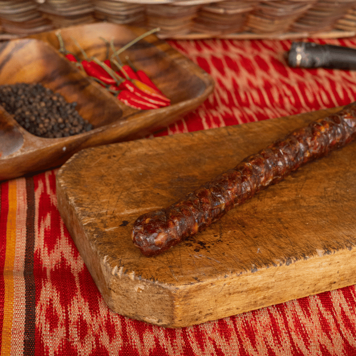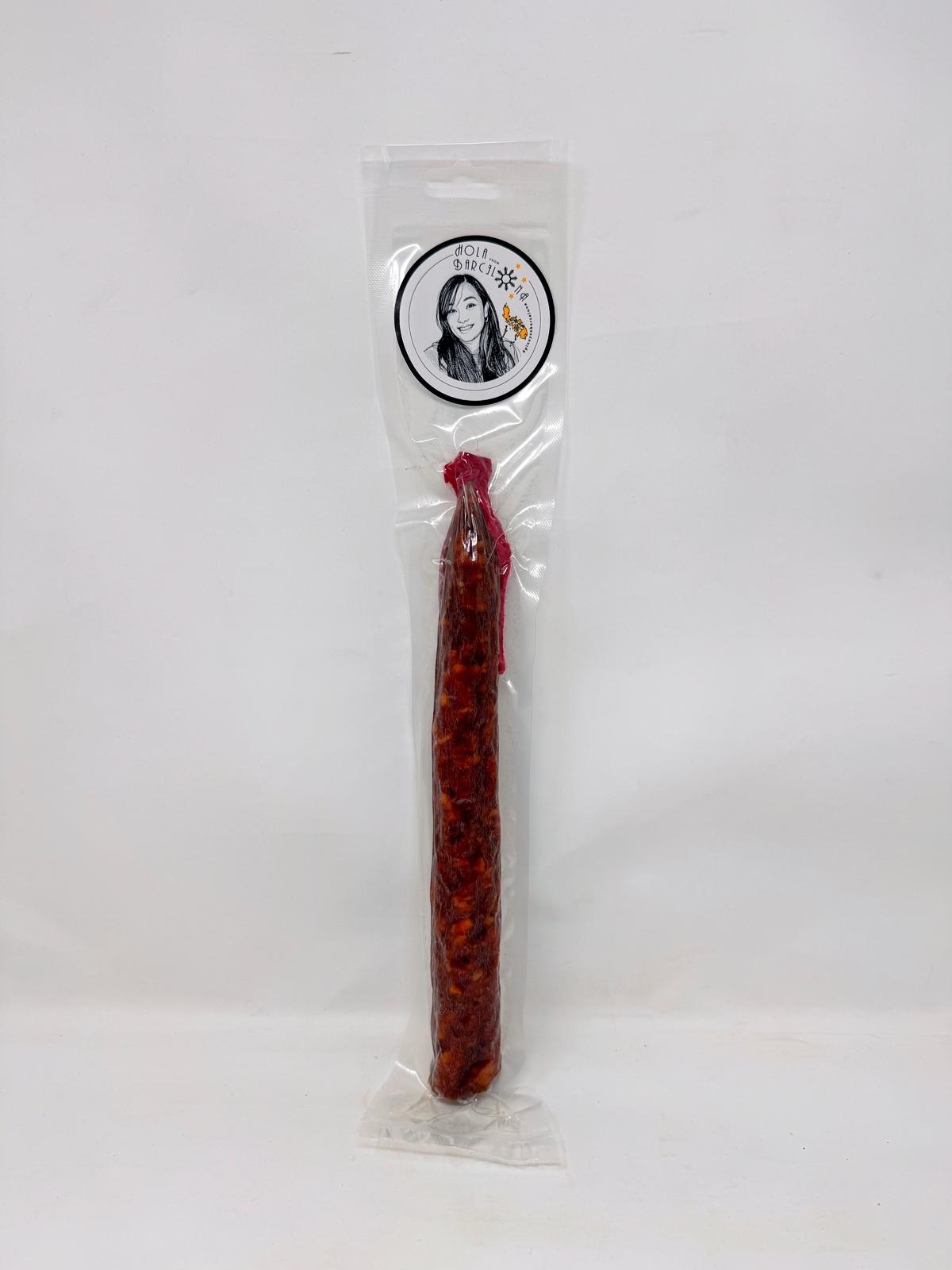 Made with care by Jelyn, known as “Pinay sa Barcelona,” and Chef Jaume from Cal Cabré 1910, this chorizo was born from her desire to help fellow Filipinos in Spain cope with homesickness. Living far from the Philippines, she recreated the comforting taste of longganisa in a form that reflects her new home in Barcelona — dry-cured, ready to enjoy anytime, and perfect for gatherings. Each piece offers a beautiful balance of savory, garlicky Filipino character and the depth that comes from slow curing.